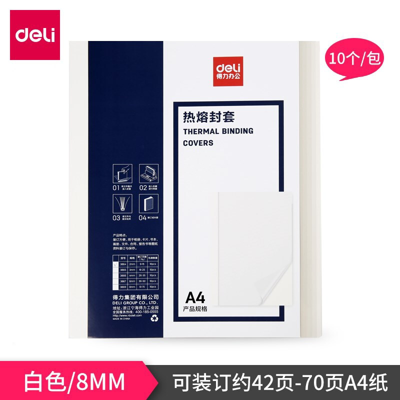 • 得力3869 热熔封套 热熔装订机专用装订封皮 A4/8mm(10个装)