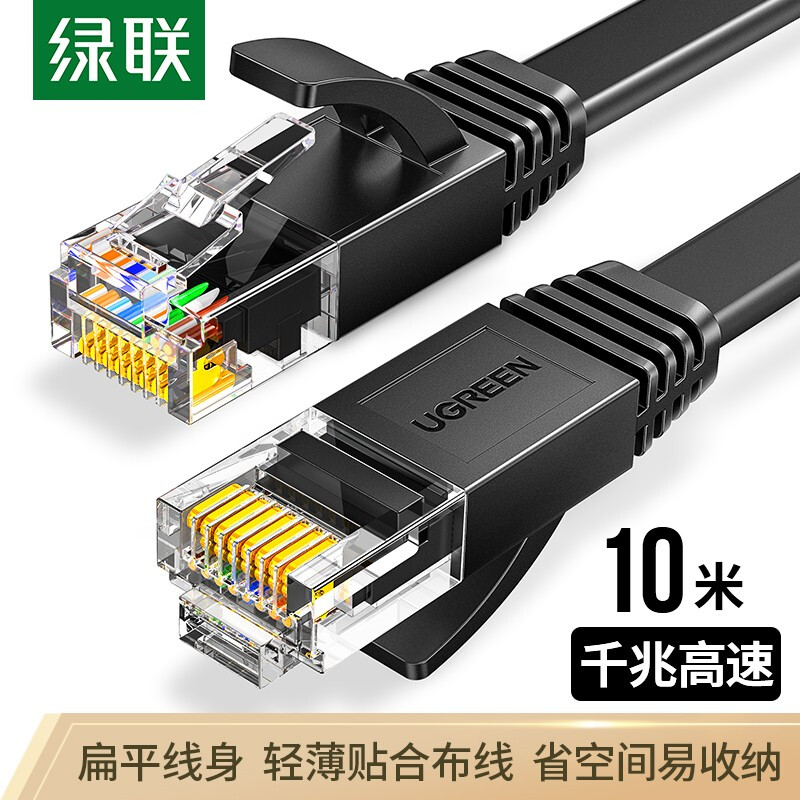 • 绿联(UGREEN)六类CAT6类网线 千兆网络连接线 电脑宽带家用监控非屏蔽扁平跳线 成品网线 黑色 10米 50178