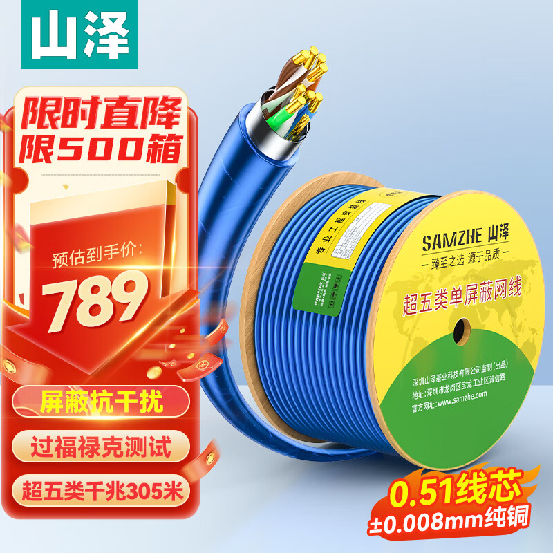 • 山泽 超五类屏蔽网线【0.51±0.008mm纯铜线芯】CAT5e千兆带屏蔽 抗干扰工程监控布线305米 FTP-305