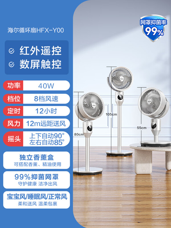 海尔(Haier)空气循环扇遥控触屏香薰抑菌交流定频电风扇家用卧室轻音风扇落地扇省电台式小风扇空调扇HFX-Y00