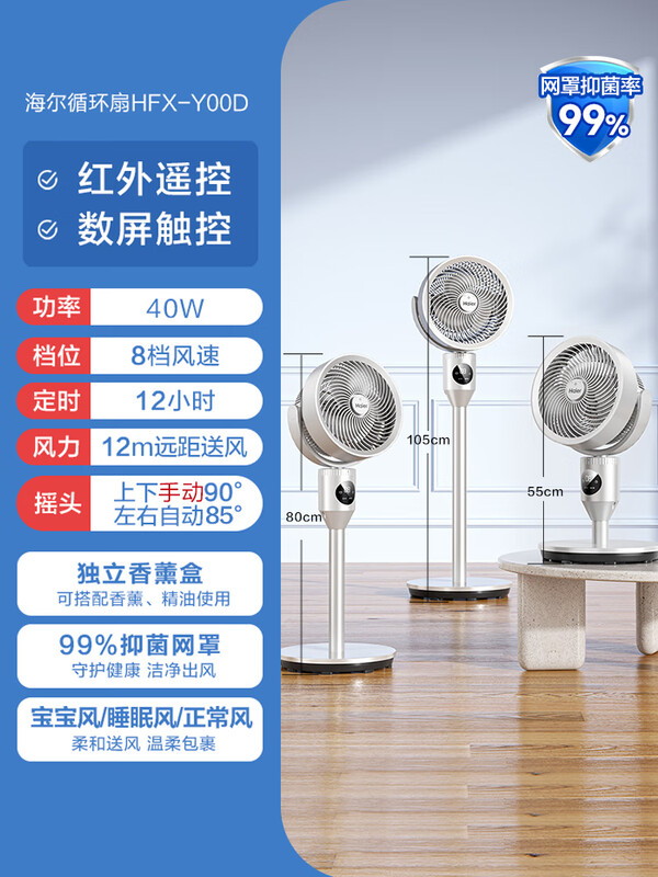 海尔(Haier)空气循环扇遥控触屏香薰抑菌电风扇交流定频家用卧室轻音风扇落地省电台式小风扇空调扇HFX-Y00D